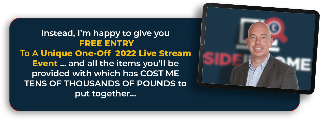 My advice is that you do whatever you can to attend a private event which truly can change the entire course of your life. A UK first and a very unique Live Stream Side Income Event 2022. Remember, this special 3 day event takes place between Friday October 28th to Sunday October 30th.